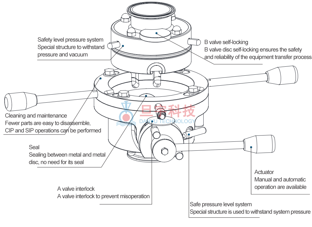 The AB valve adopts a well-designed split butterfly valve (SBV) technology, which is composed of an active valve and a passive valve. Realize material transfer under airtight conditions. The transfer process ensures that the aseptic state of aseptic materials is not damaged or prevents the diffusion of toxic materials. This transfer includes feeding, unloading, batching or sampling.