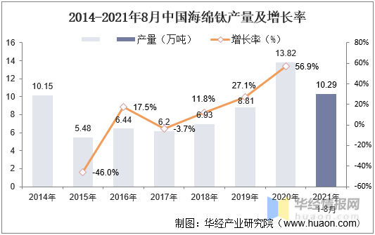 海綿鈦是鈦合金的上游主要原料,經歷2014-2015年期間的變革后,我國海綿鈦產量急劇下降,2015年產量為54785噸,同比減少46.02%,隨著高端鈦合金應用領域的拓寬,2015-2019年我國海綿鈦產量持續增長,從5.48萬噸增長至8.81萬噸,年復合增長率達到12.61%,2020年產業持續復蘇,海綿鈦產量達到13.82萬噸噸,同比2019年增長56.9%。2021年1-8月產量為10.29萬噸。