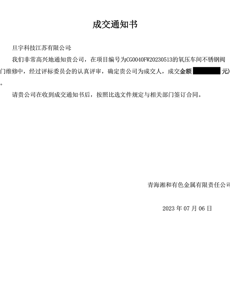 氧壓車間不銹鋼閥門維修成交通知書(青海湘和)
