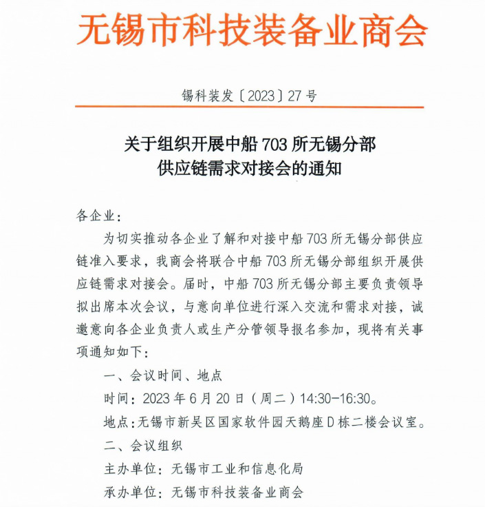 2023年6月20日公司參加由無錫市工信局主辦的中船703所無錫分部供應鏈需求對接會