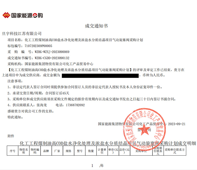 國家能源集團(tuán)化工工程煤制油高COD鹽水凈化處理及濃鹽水分質(zhì)結(jié)晶項(xiàng)目氣動(dòng)旋塞閥采購成交通知書